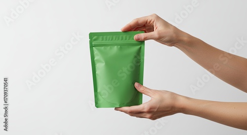pouch, woman, holding, green, zip, cardboard box, blank, presentation, display, package, stand up, zip, retail, consumer, hand, arm, white, background, studio, plain, simple, clean, soft, light, copy space, closeup, product, template, design, mock, container, flexible, food, cosmetic, storage, delivery, shipping, mock-up, marketing, promotional, advertising, commercial, pack