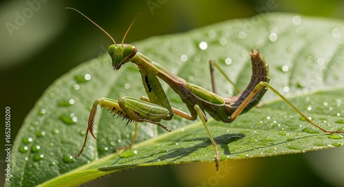 Green Praying Mantis Insect Sitting On Dew Covered Leaf Closeup Macro Nature