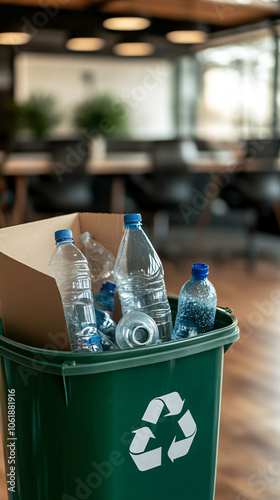 recycling, plastic, bottle, office, bin, waste, environment, sustainability, eco, friendly, green, reusing, pollution, environmental, protection, responsible, sorting, garbage, trash, container, symbol, ecology, reuse, reduce, separate, management, corporate, social, responsibility, workplace, interior, blurred, background, indoor