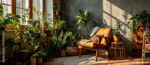 Green relax zone in the room with opened book and potted flowers Reading place near houseplants Nobody Boho style eco design in cozy house Digital detox no gadgets. Creative Banner. Copyspace image