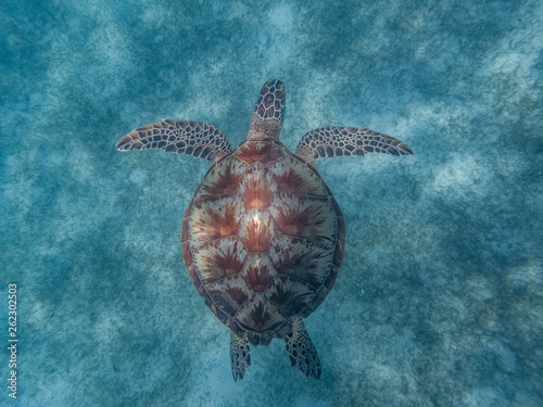 Green sea turtle swimming above a sandy reef closeup. Sea turtles are becoming threatened due to illegal human activities.