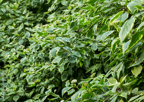 green shrub spiraea texture natural background vegetable eco plant with bean leaf