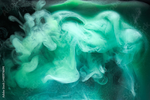 Green smoke on black ink background, colorful fog, abstract swirling emerald ocean sea, acrylic paint pigment underwater