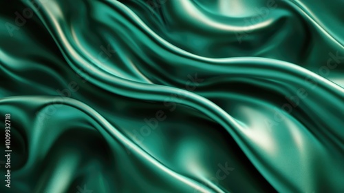 Green soft satin fabric waves background design. Texture with smooth flowing patterns and light shiny effect
