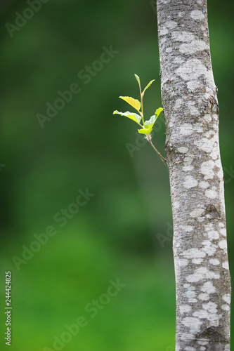 Green sprout growing from the trunk of a Black Alder tree (Alnus glutinosa). Focus on sprout, shallow depth of field.