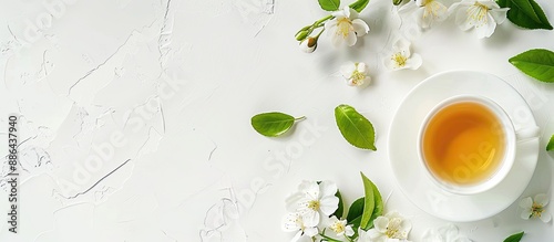 Green tea leaves and jasmine flowers displayed with a cup of tea on a white background featuring a top view with copy space image for floral tea presentation