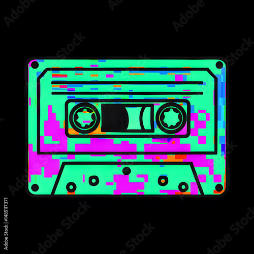 blue, purple, pink, teal, retro, cassette, tape, icon, logotype, vintage, music, isolated, black background, glitch, 80s, 90s, 80s, pixelated, cool, audio, sound, old, media, white, analog, obsolete, illustration