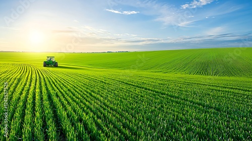 serene, machinery, peaceful, production, tranquil, aerial view, vibrant, harvest, horizon, growth, meadow, calm, farmland, daylight, dirtied, planting, crop, tractor, rural, scenic, industry, technology, sun, sunset, cloud, blue, sky, greenfield, equipment, grass, green, field, bright, nature