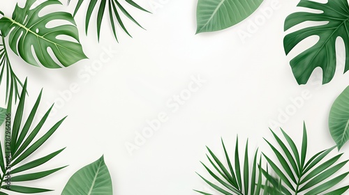 leaf, green leaf, white background, summer, tropical, foliage, nature, green, white, plant, frame, border, arrangement, design, pattern, texture, background, image, palm leaf, topview, copy space, blank space, empty space, green background