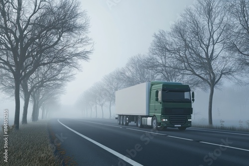 truck, road, fog, vehicle, driving, transport, delivery, logistic, travel, freight, highway, cargo, transportation, shipping, route, path, journey, overcast, misty, weather, autumn, season, countryside, rural, outdoors, nature, environment, lane, asphalt, tree, tree, forest, branch, tree branch, landscape, scenery, cloud, cloudy, grey, grey, distance, motion, moving, speed, traffic, auto, automobile, drive