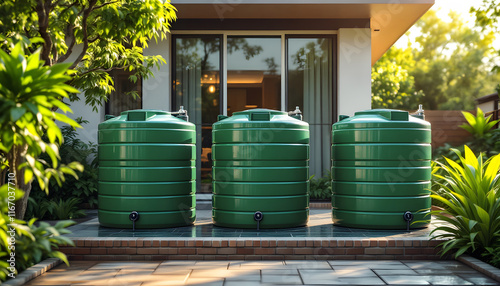 Green Water Tanks for Rainwater Harvesting, Sustainable Living, Outdoor Water Storage, Eco-Friendly Home, Water Conservation System
