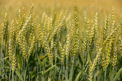 Green wheat field in grain filling growth stage. Cereal grain farming, commodity market and trade concept.