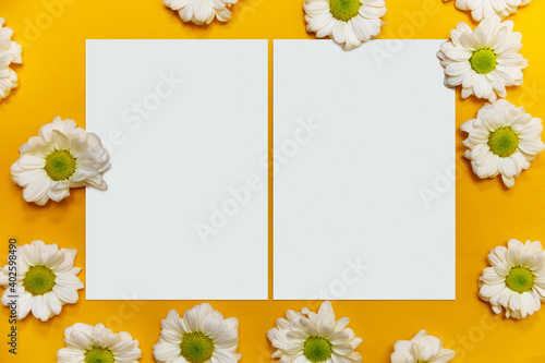 Greeting cards mockup with chamomile. Empty postcards with space for text. Bright trendy color yellow background. Template with cards and daisies. Atmospheric moments.