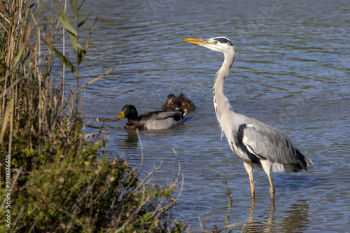 Grey heron, ardea cinerea, and mallard ducks in the Camargue in France