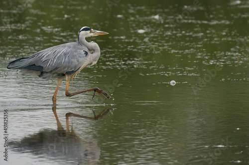 Grey Heron (Ardea cinerea) hunting in a shallow lake at Langford Lakes Nature Reserve in Wiltshire, England, United Kingdom