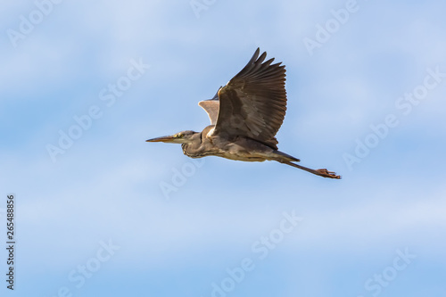 Grey heron (Ardea cinerea) in flight seen from below on the blue sky.