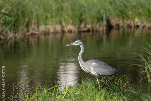 Grey heron (Ardea cinerea) patiently walking on a grassy bank near a still waterway