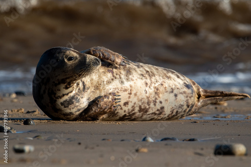 Grey seal resting/laying by the sea at Horsey Gap beach, north Norfolk, UK. January 2022