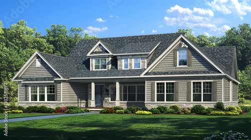 house, home, residential, architecture, building, real estate, property, exterior, design, grey, grey, two-story, roof, window, door, landscaping, lawn, tree, front yard, driveway, new home, modern, contemporary, craftsman, style, suburban, countryside, sunlight, daylight, bright, daytime