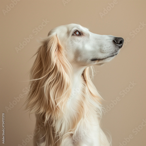 Greyhound dog saluki portrait closeup on beige background.