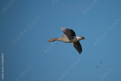 Greylag goose flying in the evening sunlight in the bird protection area Hjälstaviken close to Stockholm