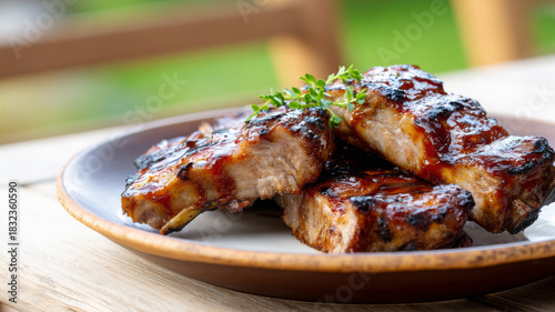 Grilled barbecue ribs served on a rustic plate, garnished with fresh herbs, showcasing a delicious meal perfect for outdoor dining and culinary enjoyment