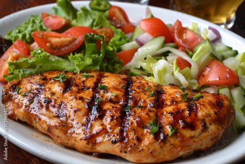 grilled, chicken, breast, fresh, salad, meal, food, dinner, lunch, healthy, vegetable, tomatoes, lettuce, celery, plate, protein, diet, nourishment, cooking, cookery, juicy, tender, herb, seasoning, savoury, delicious, homemade, wooden, table, green, organic, lean, mealtime, garnish, balanced, culinary, dish, eat, wood, background, serving, main, course, dining, eatery, gastronomy