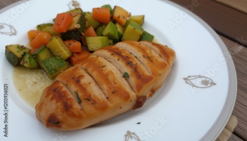 Grilled chicken breast with herbs served alongside fresh vegetables on a decorative plate.