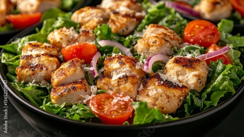 salad, food, chicken, meal, healthy, fresh, nourishment, cookery, vegetable, dish, lettuce, tomatoes, onion, dinner, lunch, grilled, delicious, diet, bowl, green, eat, eatery, tasty, organic, plate, cooked, cheese, parmesan, red, white, purple, black, leaf, garden, freshness, dieting, cookery, portion, prepared, serving, still life, closeup, studio shot, no people, table, indoor, presentation, arrangement