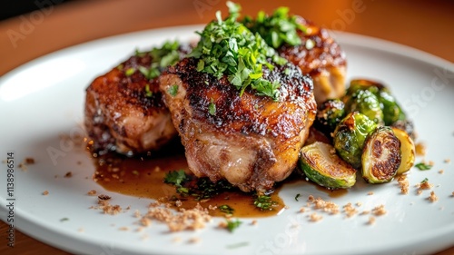 Grilled chicken thighs with caramelized Brussels sprouts garnished fresh herbs on white plate
