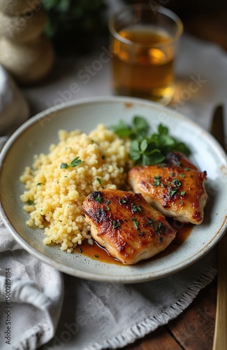 Grilled chicken thighs with couscous and herbs on a plate. Meal is served with glass of beverage. Dish is made for lunch or dinner. Focus on food photography, healthy eating. Top view, close-up.