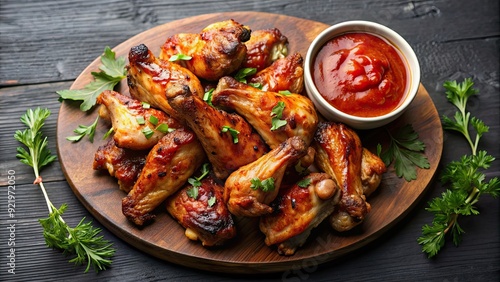 Grilled chicken wings with sauce exploding behind, grilled, chicken wings, sauce, BBQ, spicy, savory, tasty, food photography