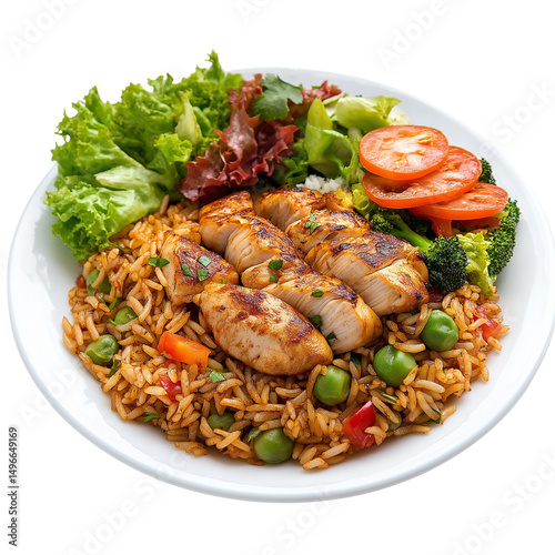 Grilled chicken with rice and vegetables. PNG image, transparent background