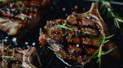 Grilled meat with herbs showcases delicious and appetizing presentation. juicy steaks are perfectly cooked, garnished with fresh rosemary and sprinkled with coarse salt, creating mouthwatering dish