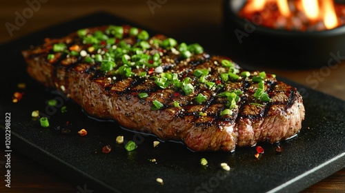 grilled, peppercorn, steak, scallion, slate, meat, beef, juicy, cooked, seasoning, savoury, meal, epicure, dinner, bar-b-q, herb, spice, charred, succulent, sizzling, delicious, accessing, food, culinary, kitchen, fresh, dining, roasted, fire, seared, garnished, flames, tender, nourishment, serving, appetising, texture, black, chopped, plate, cookery, tasty, protein