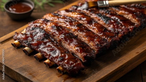 Grilled pork ribs arranged neatly on a cutting board, with a small brush applying a thick layer of glaze, showcasing their perfect caramelization