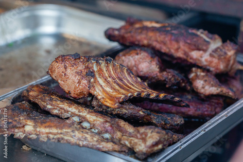 Grilled pork ribs on the grill at street food festival