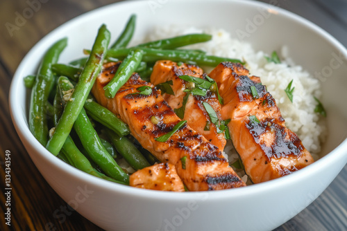 Grilled Salmon and Vegetables Bowl. Grilled salmon with green beans and rice in a bowl ideal for healthy eating promotions.
