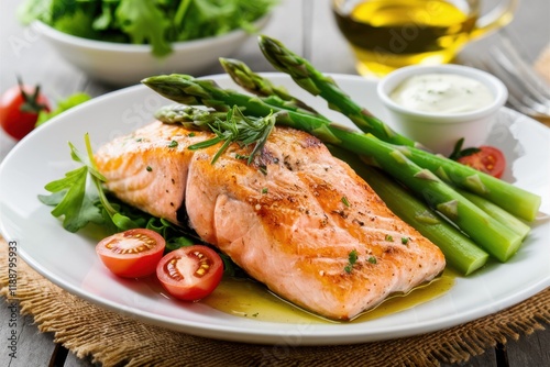 Grilled salmon fillet, vibrant asparagus spears, cherry tomatoes, arugula garnish, white ceramic plate, wooden table, olive oil drizzle, rustic setting, food photography, gourmet meal, healthy cuisine