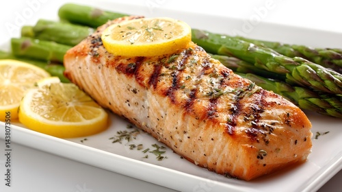 Grilled salmon steak with asparagus and lemon slices, a healthy and delicious meal option. The food is nicely plated on a white background.