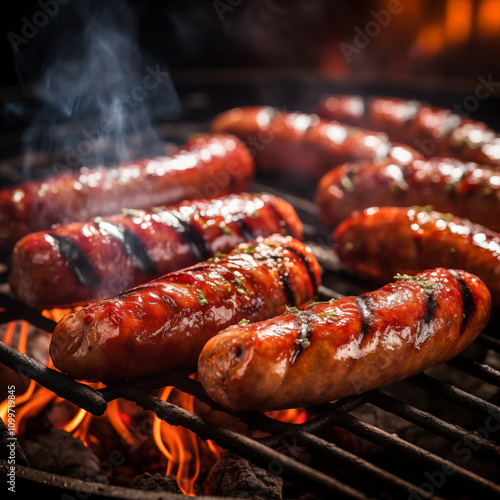 Grilled sausages. BBQ sausages. Homemade sausages cooked on the grill.