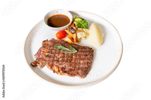 Grilled Steak Delight: A perfectly grilled steak, adorned with fresh herbs, takes center stage on a pristine plate, surrounded by a medley of vibrant vegetables, a dollop of creamy mashed potatoes.