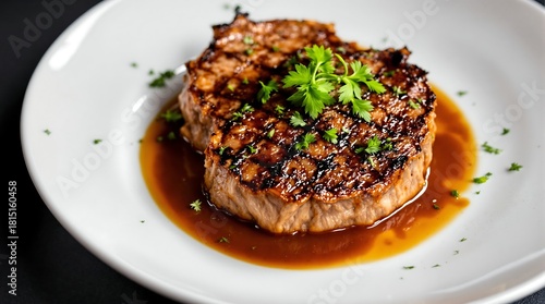 Grilled Steak Served on White Plate with Brown Sauce and Parsley