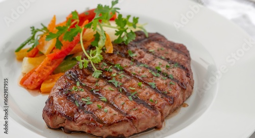 Grilled steak served with vegetables and garnish on a white plate, closeup shot.