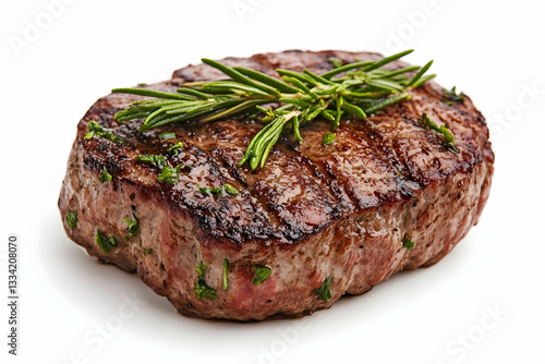 Grilled steak with rosemary garnish, isolated on white background