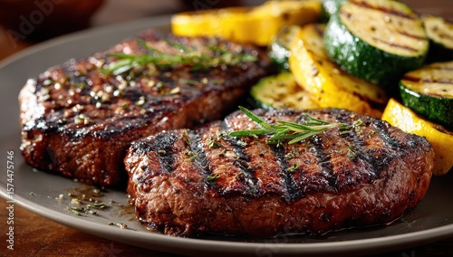 steak, grilled, courgette, squash, plate, food, meal, dinner, lunch, cookery, delicious, healthy, cooked, rosemary, garnish, fresh, vegetable, alimentary, protein, diet, epicure, eatery, brown, yellow, green, appetising, succulent, juicy, culinary, closeup, presentation, prepared, table, roasted, summer, bar-b-q, organic, natural, tasty, elegant, platter, serve, dish, dining, rustic, fine, ingredient