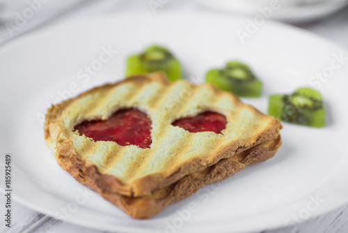 food, bread, breakfast, february 14, love, nubes, toast, sandwich, crisp, form, cut, grilled, fried, strip, plate, white, care, attention, background, kiwi, slice, decorated, fruit, copy space