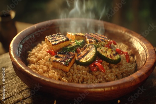 Grilled Tofu with Vegetables on Warm Quinoa in Rustic Wooden Bowl with Steam Rising in Natural Outdoor Setting