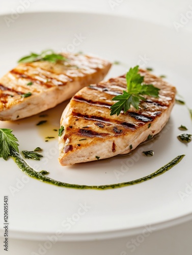 Grilled turkey fillet with garlic sauce, presented on a simple white plate. Minimalistic setup with clean lines, and artistic drizzles of garlic sauce and herb oil as key compositional elements.