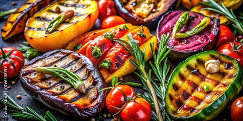 dark background, food photography, closeup, healthy eating, gourmet food, fine dining, vegetable, pepper, courgette, aubergine, onion, asparagus, tomatoes, broccoli, carrot, bar-b-q, culinary arts, vegetarian food
